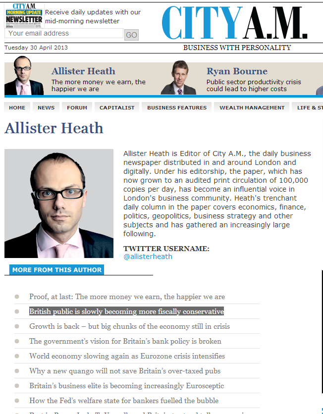 Since Allister Heath became editor of City A.M., the London business newspaper has developed an influential voice in the city and an audited print circulation of 100,000 copies per day. Allister’s daily blog which covers the latest news and thoughts on topics such as business strategy, finance, politics and geopolitics is an interesting and informative morning read.